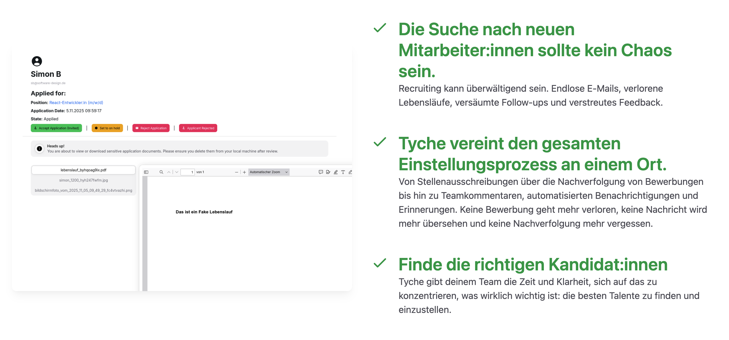 Recruiting ist oft unübersichtlich: E-Mails, verlorene Lebensläufe, verpasste Follow-ups und verstreutes Feedback. Tyche bringt Struktur in den Prozess und sorgt dafür, dass keine Bewerbung übersehen wird.